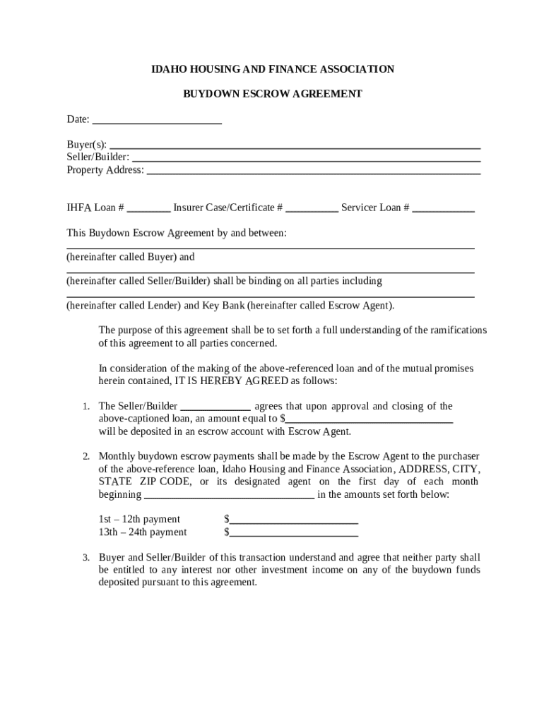 In the event of a property sale, the terms laid out in the buydown escrow agreement play a significant role in determining the fate of escrow funds. It is vital to understand how any unused buydown funds will be managed once the property changes hands.