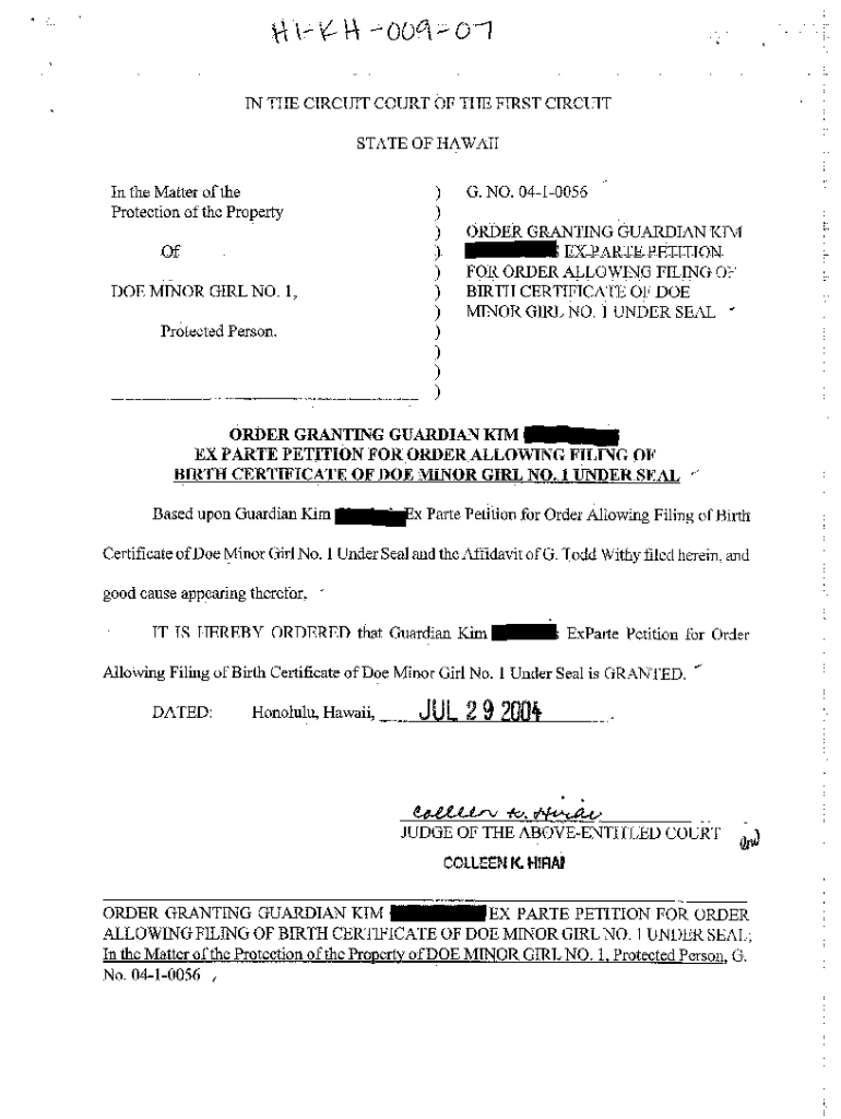 A07 Order Granting Guardian's Ex Parte Petition for Order Allowing Filing of Birth Certificate of Minor Girl Under Seal
