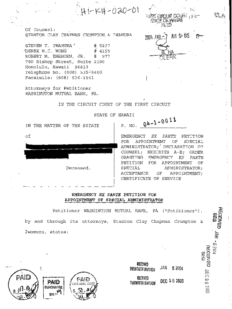 A01 Emergency Ex Parte Petition for Appointment of Special Administrator regarding Foreclosure Suit Pending Against Decedent