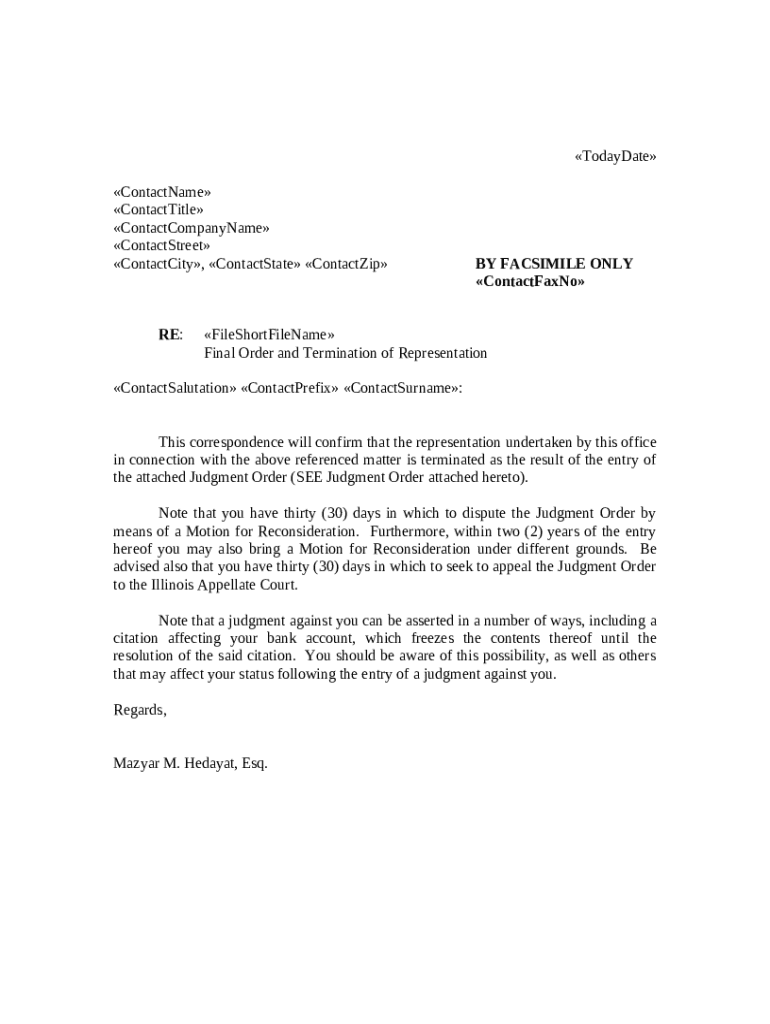 Termination Letter: Entry of Judgment: This letter is sent from an Attorney to his/her Client stating that a Judgment has been entered in his/her cause of action. Due to this entry, the Attorney