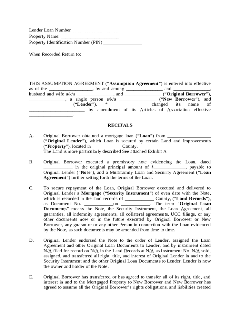 An assumption agreement is a legal document that allows one party to take over the contractual obligations of another party.