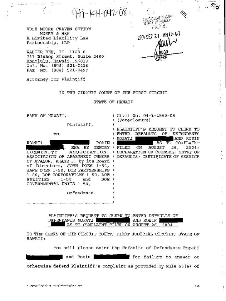 A08 Plaintiff's Request to Clerk to Enter Defaults of Defendant to Complaint