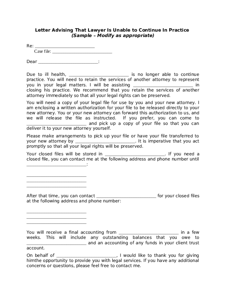 Comprehensive guide to the letter advising that lawyer is unable to continue in practice
