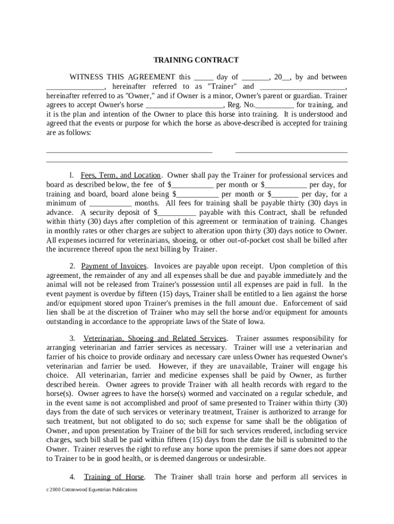A training contract in the equine industry is a formal agreement between a horse trainer and the owner that outlines the terms of service. Having a written agreement is crucial, as it protects the interests of both parties and helps to clarify expectations.