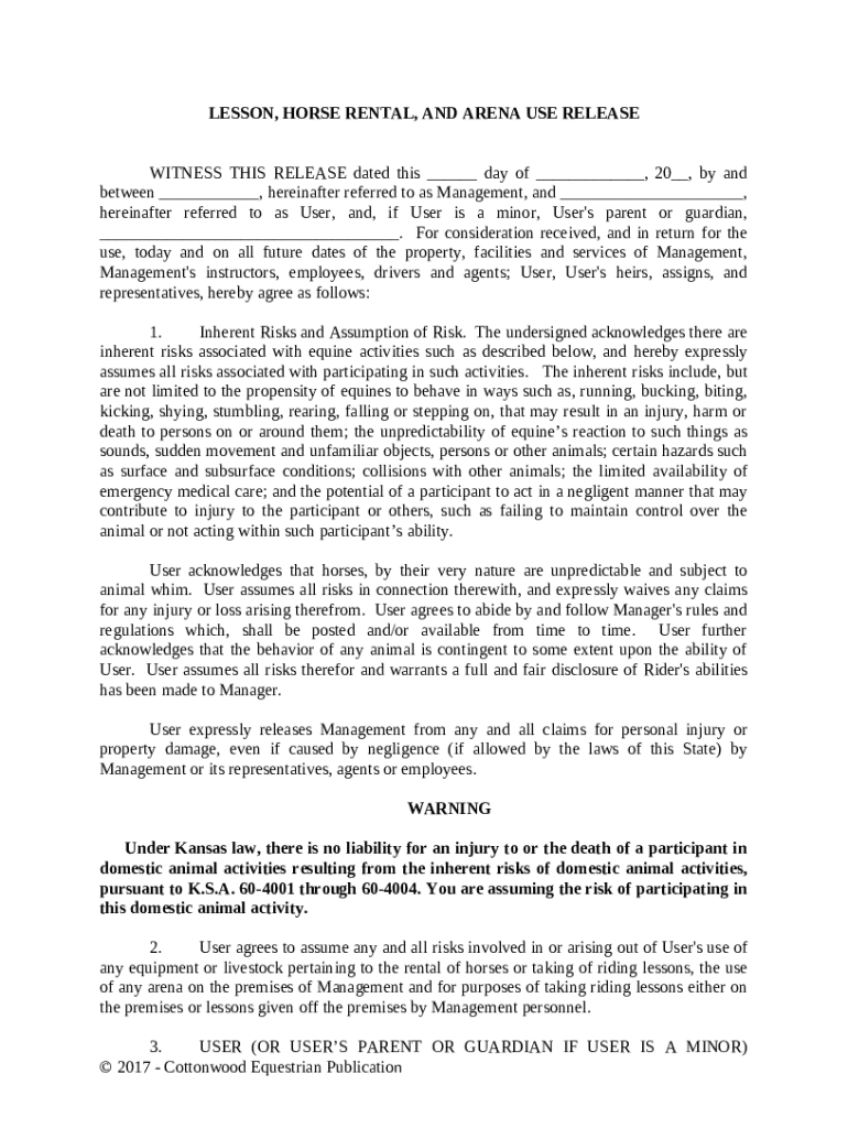 This Lesson, Horse Rental, and Arena Use Release Horse Equine Form is a lesson, horse rental and arena rental release form for a user to sign before being given lessons, or being rented a horse or