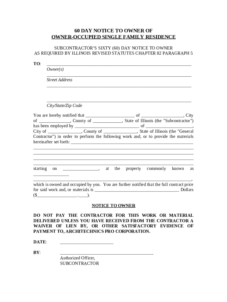The 60 Day Notice is a legal requirement under the Illinois Revised Statutes Chapter 82 Paragraph 5, designed to inform property owners of potential claims by subcontractors. It serves as an alert that the person or entity providing labor or materials may have lien rights.