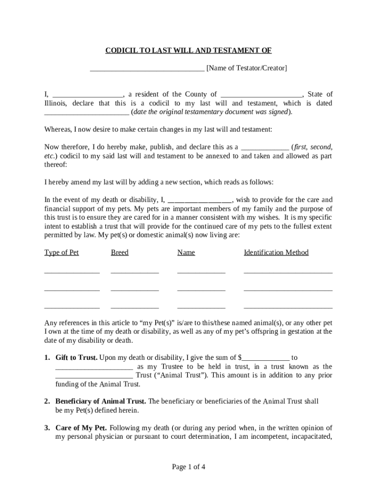 Get the free Codicil to Will for Amending Your Will - Testamentary Pet Trust template