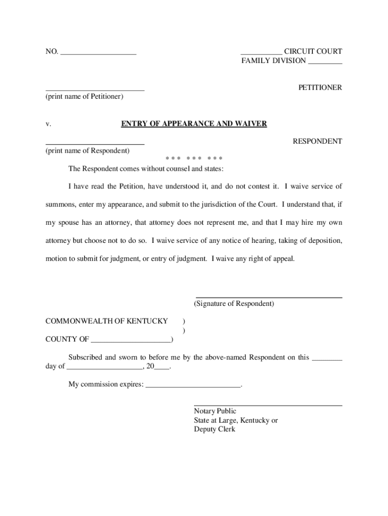 The entry of appearance and waiver form must include several critical details to be valid. This includes the court identification number where the case is filed, the petitioner’s and respondent’s information, and a clear statement of intent to waive further legal rights.