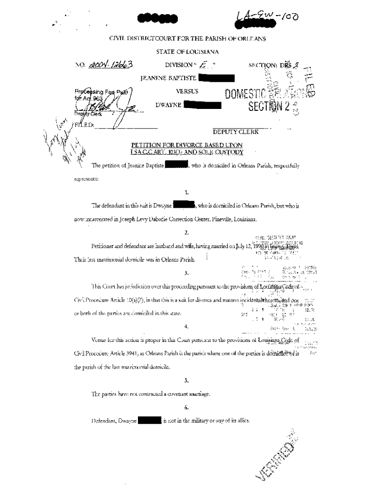 Get the free Petition For Divorce Based Upon LSA C.C ART. 103(3) And Sole Custody