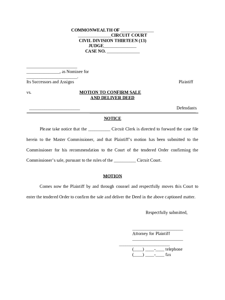 Get the free Motion to Confirm Sale And Deliver Deed template