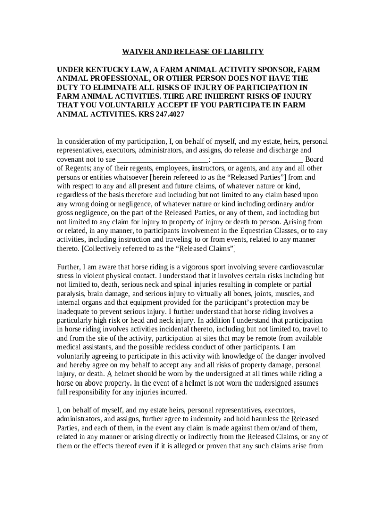 Template Waiver and Release of Liability for Equestrian Classes instructions