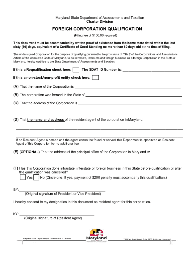 Filling out a Maryland registration of foreign form requires careful attention to detail. First, gather the necessary documentation such as proof of existence and a Certificate of Good Standing from your home state. Complete the FOREIGN CORPORATION QUALIFICATION form accurately and submit it along with the required filing fee to the Maryland State Department of Assessments and Taxation.