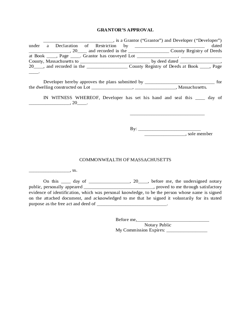 This form is used by the Grantor (owner) to give approval of the Developer's plans and restrictions for the property.