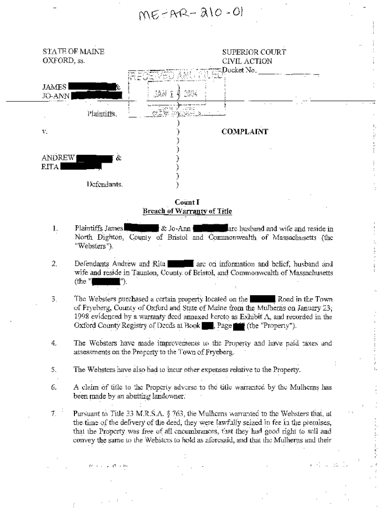 A01 Complaint - Breach of Warranty Title and Rescission of Contract to Purchase Property
