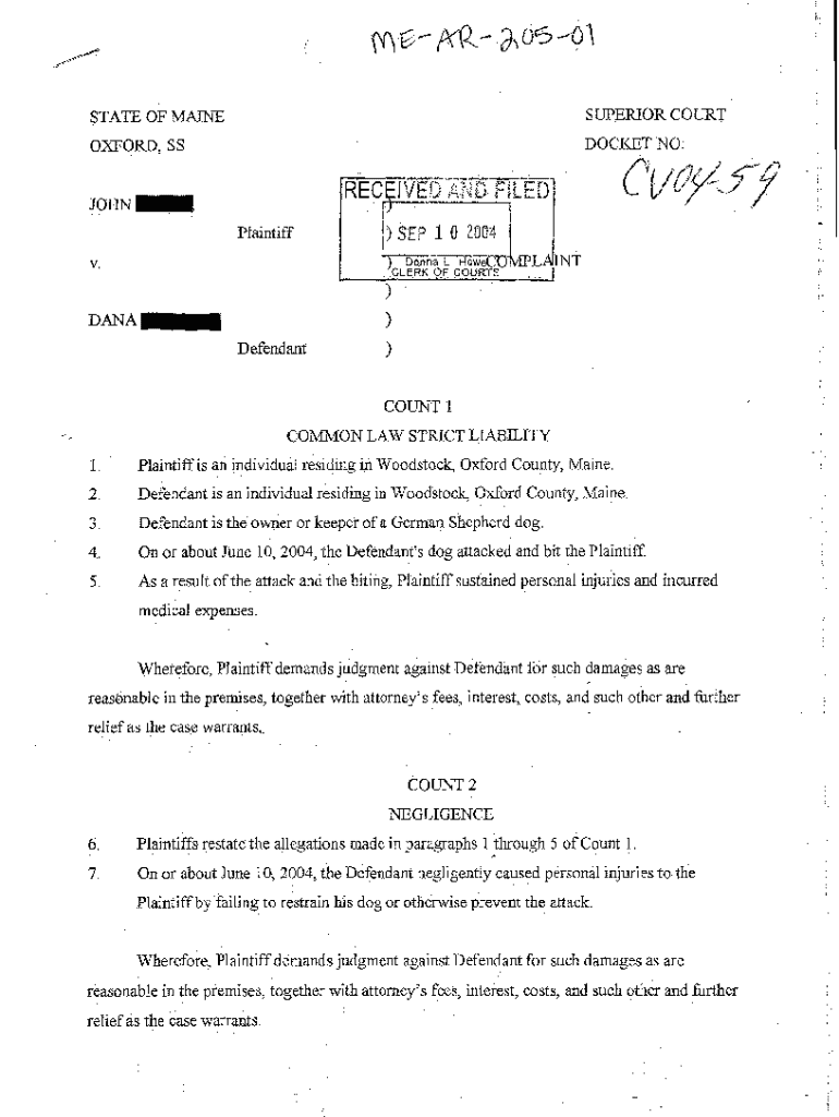 A01 Complaint - Strict Liability Personal Injuries Due to Dog Bite