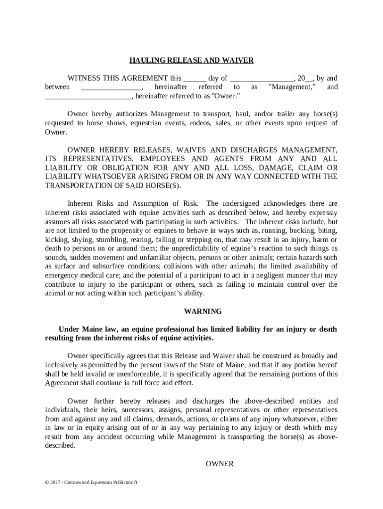 Get the free Hauling Release and Waiver - Horse Equine s template