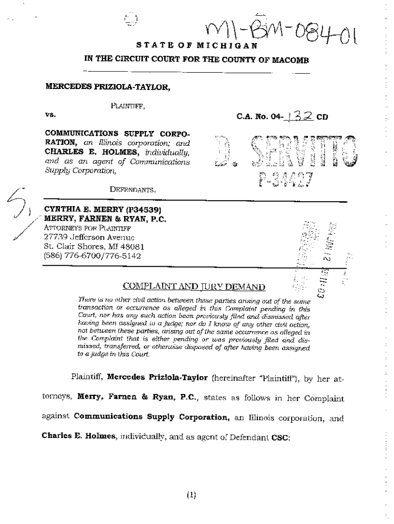 A01 Complaint And Jury Demand regarding Sexual Harassment Allegations