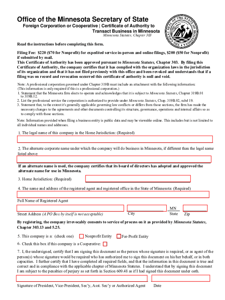 Get the free Minnesota Registration of Foreign Corporation