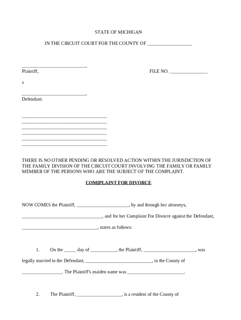 Understanding the structure of a divorce complaint is vital for a successful filing. The plaintiff, the person initiating the divorce, and the defendant, the person responding, play crucial roles in this process. It is important to establish jurisdiction, which in Michigan is typically the Circuit Court. Additionally, you must clarify that there are no other pending or resolved actions regarding the marriage to ensure your complaint is valid.
