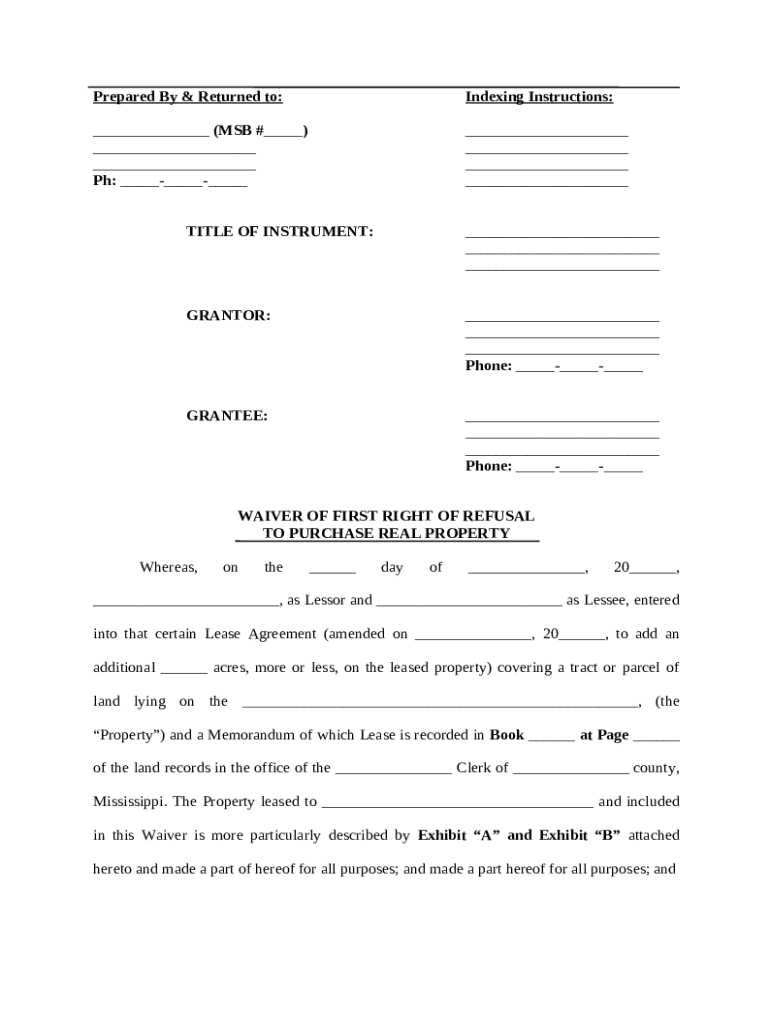 A waiver of first right is a legal document that relinquishes the holder's right of first refusal or right to purchase a property or asset before others can.