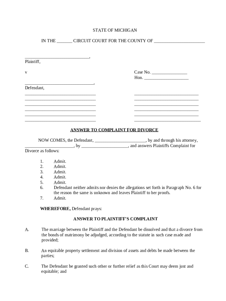 Answer to Complaint for Divorce: An Answer to Complaint for Divorce is filed by the Defendant. In this form, he/she admits or denies the allegations made by the Plaintiff in his/her Complaint for