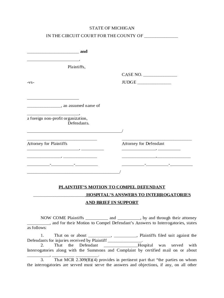 Get the free Plaintiff's Motion to Compel Defendant Hospital's Answers to Interrogatories and Bri...