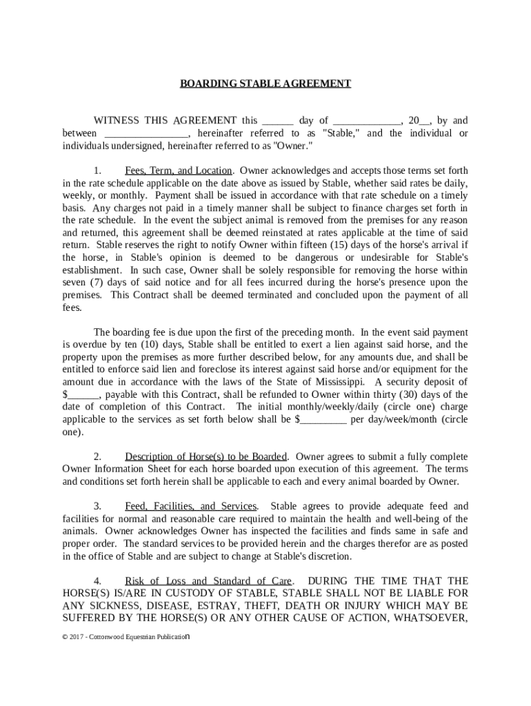 A boarding stable agreement is a contract between a horse owner and a stable owner that outlines the terms and conditions for boarding a horse at the stable.