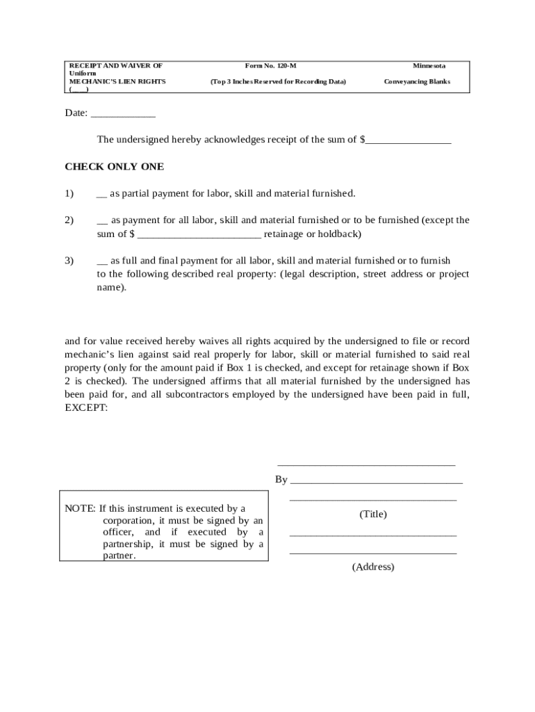 This Receipt and Waiver of Mechanics Lien Rights form is for useto acknowledge receipt of a sum of money as partial payment for labor, skill and material furnished or to be furnished to particular