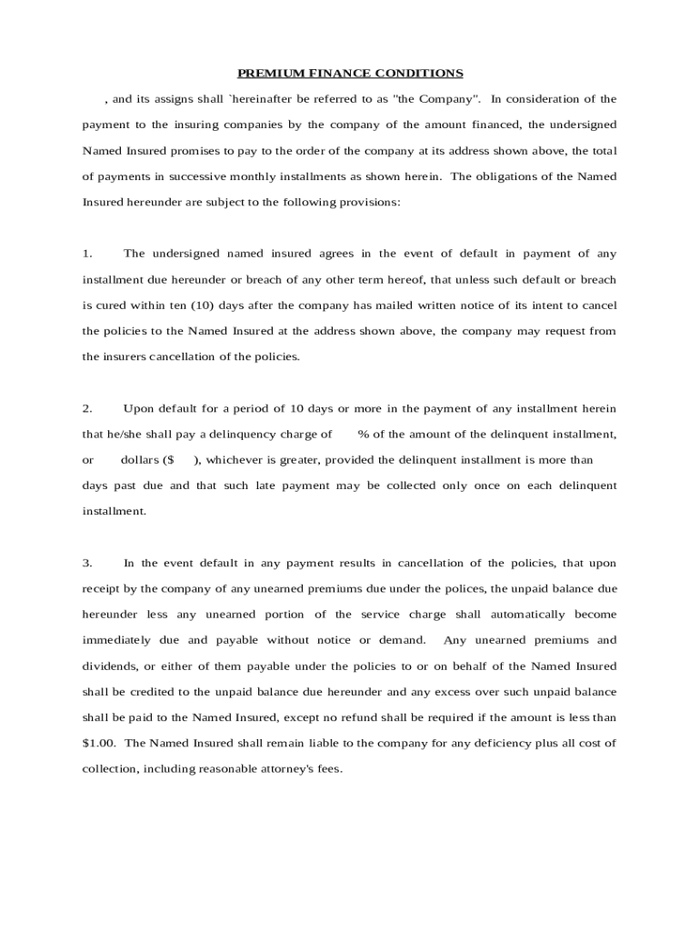 Premium finance conditions refer to the contractual terms outlining the responsibilities of the policyholder and the finance company in managing insurance premium payments. These conditions are crucial for both insurers and policyholders, as they establish clear expectations regarding payment obligations and consequences for default.
