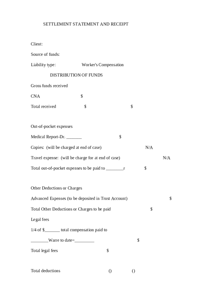 This is a Settlement Statement and Receipt, to be used in the State of Mississippi. It details the settlement agreed upon by the two parties, as well as an acknowledgment that both parties received