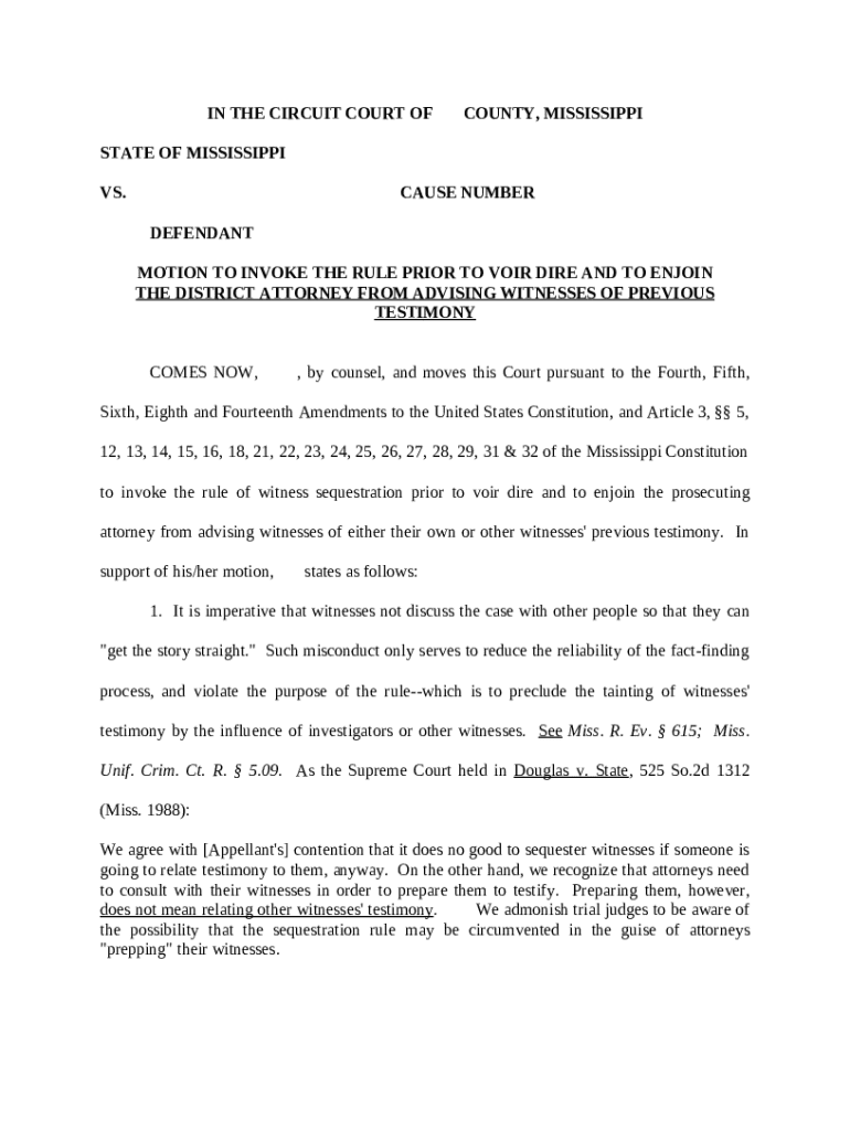 Get the free Motion to Invoke the Rule Prior to Voir Dire and To Enjoin the District Attorney Fro...