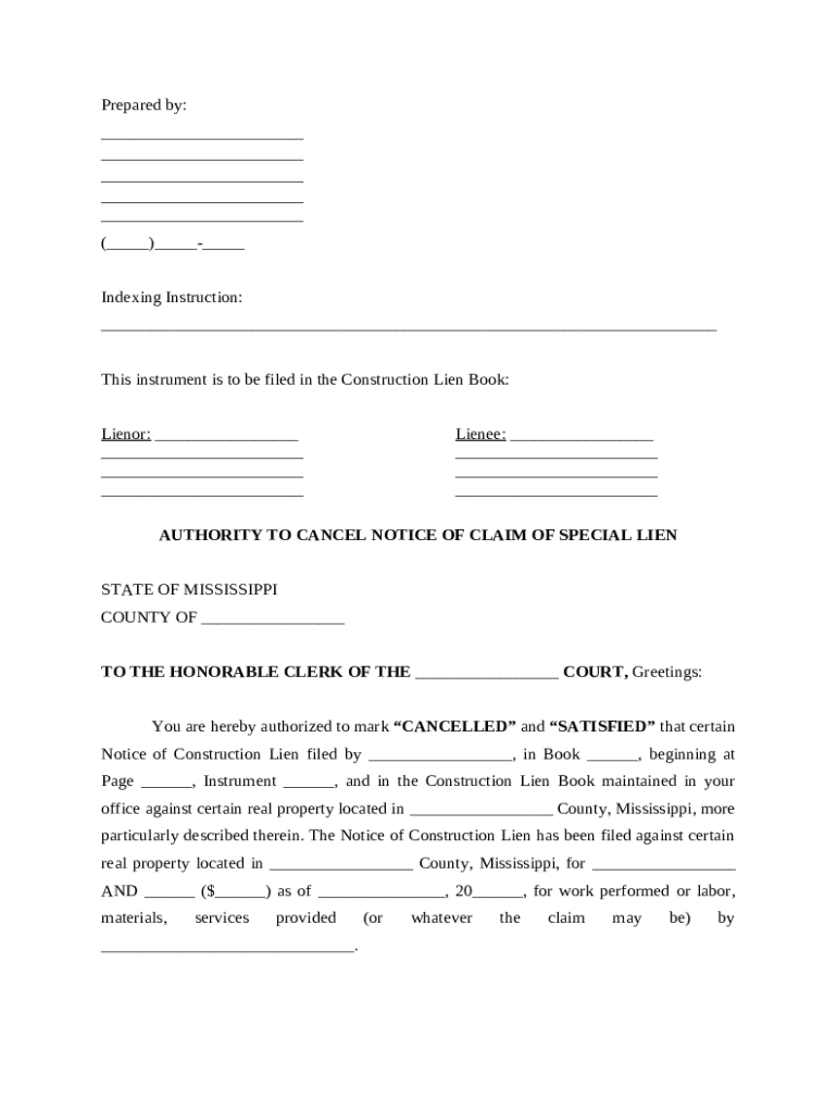 The authority to cancel notice form is a crucial document in managing liens and property transactions, particularly in Mississippi. This guide provides comprehensive insights into its purpose, who needs it, how to fill it out, and essential legal implications.