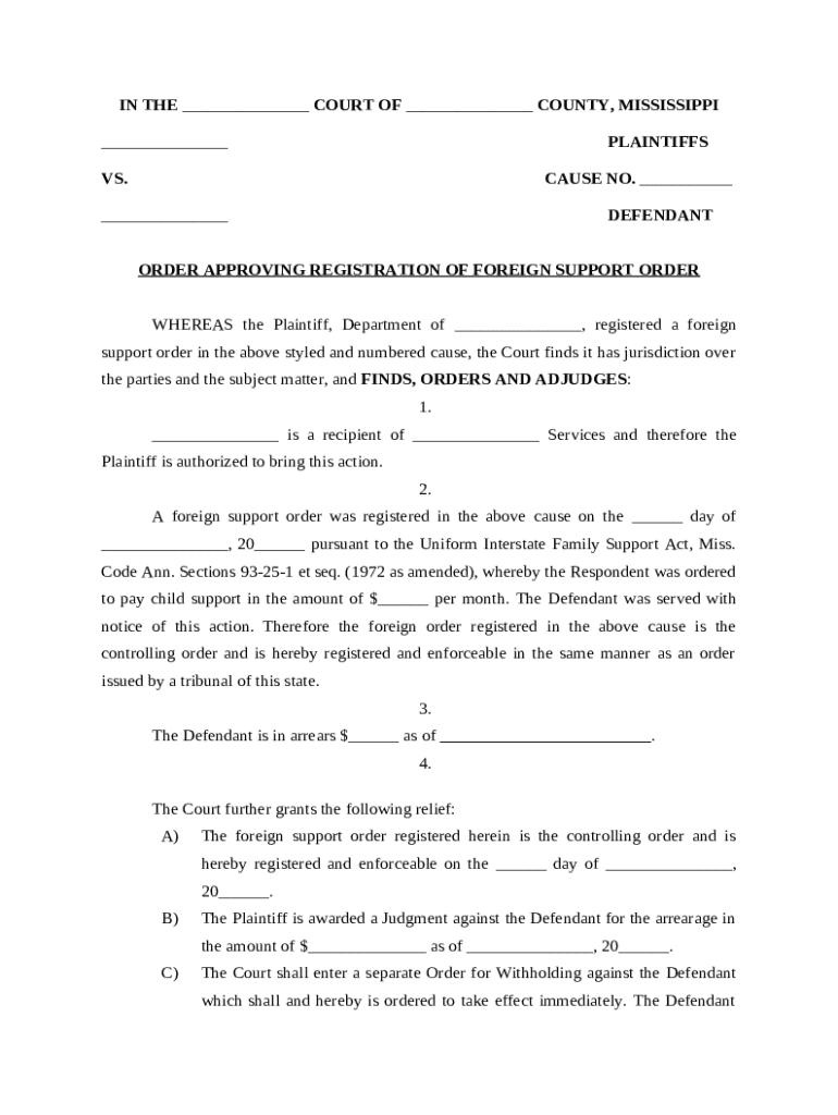 Filling out an order approving registration of form form involves specific steps and a clear understanding of legal terms. This guide will provide a step-by-step approach to effectively complete this form, ensuring compliance with Mississippi’s regulations regarding foreign support orders.