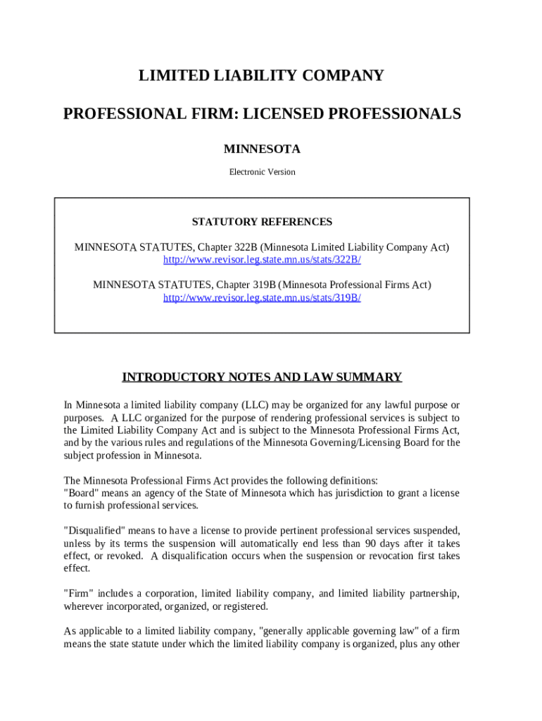 Minnesota Statutes Chapter 319A: This act pertains to professional firms, including how professional LLCs must operate.