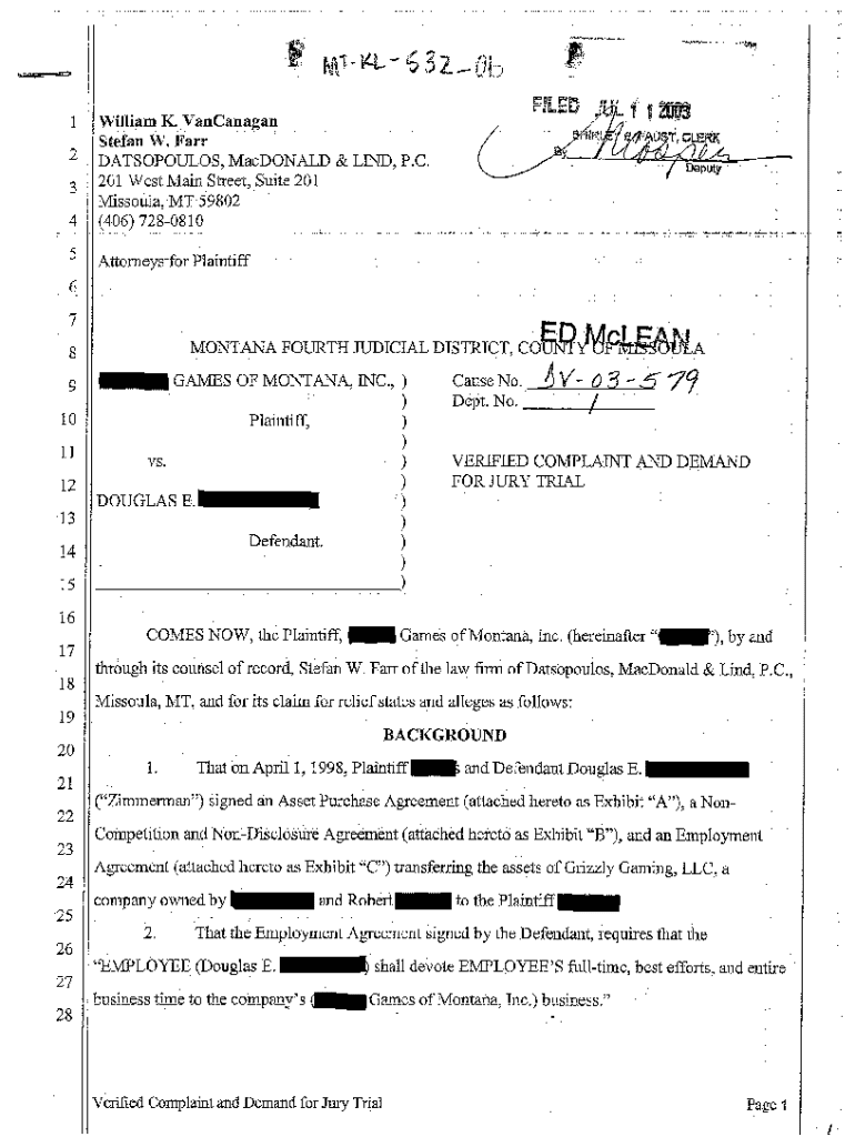 Get the free A01 Verified Complaint and Demand for Jury Trail regarding Breach of Contract
