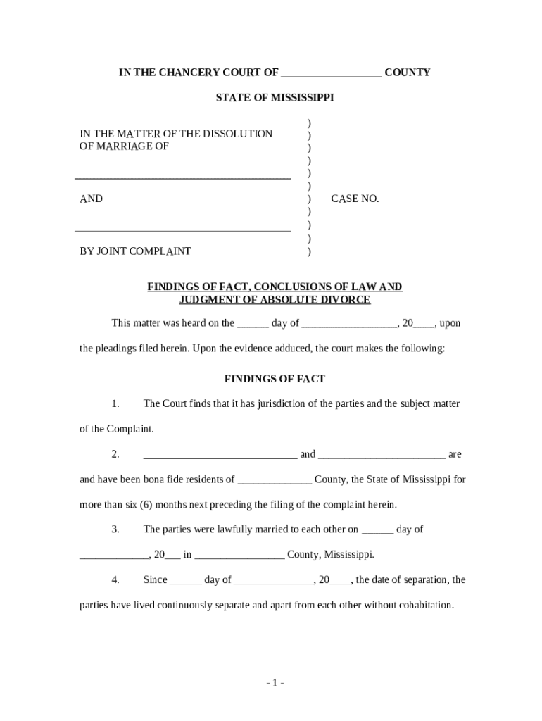 The Mississippi divorce process typically begins with filing a petition in the Chancery Court. This includes necessary filings and documents, such as the Joint Complaint and the Separation and Property Settlement Agreement. The court will issue Findings of Fact and Conclusions of Law, which are essential in finalizing the divorce.