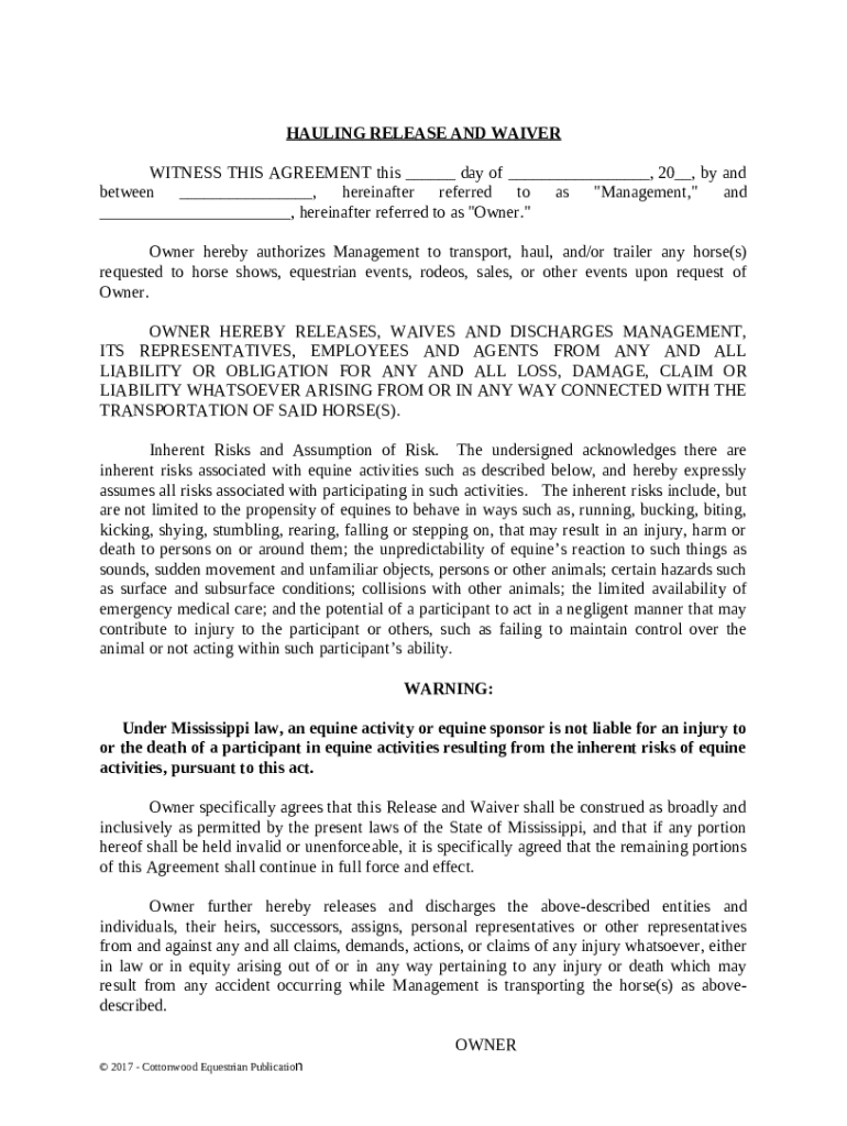 This Hauling Release and Waiver Horse Equine Form is a hauling release and waiver used in the situation where a horse owner agrees to allow another person to transport, haul and/or trailer a horse