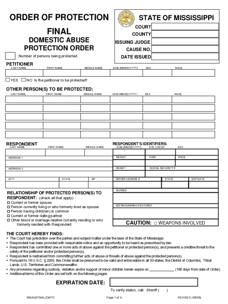 A final domestic abuse protective order is a legal document designed to safeguard individuals from domestic violence. Under Mississippi law, these orders serve to impose restrictions on an abuser's behavior, ensuring the safety and rights of the victim. Securing a protective order is a crucial step for anyone facing threats or violence from a domestic partner.