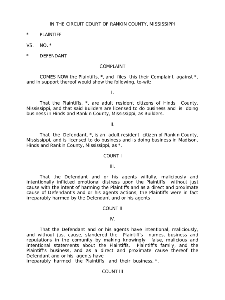 Mississippi model pleadings. Adapt to fit the specific facts of your case. Don't reinvent the wheel.