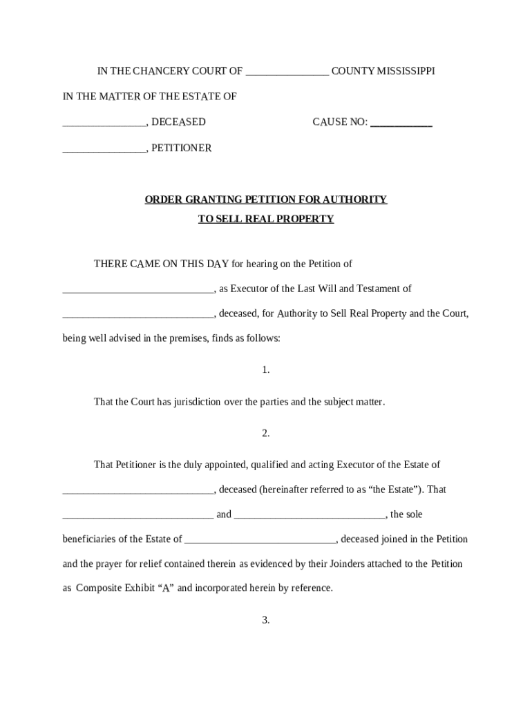 The order granting petition serves as a formal request to obtain legal authority for selling real estate, especially when the property is part of an estate. It holds significant legal weight in estate matters, ensuring that all actions comply with relevant laws and regulations.