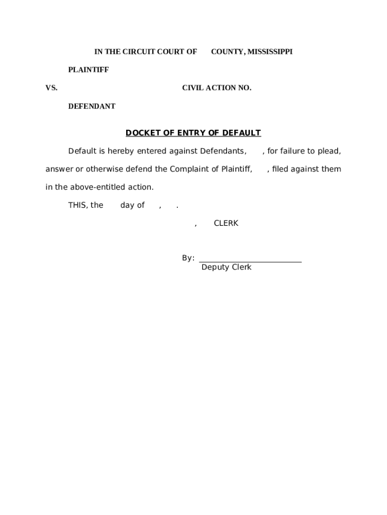 Docket of Entry of Default: A Docket for Entry of Default is a pleading signed by the court clerk and entered into the recrd books. It simply states that a Default Judgment was entered against the