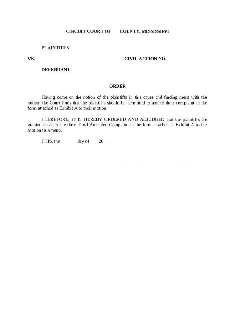 An order allowing amended complaint is a legal document granting permission for a party to modify their original complaint in a court case.