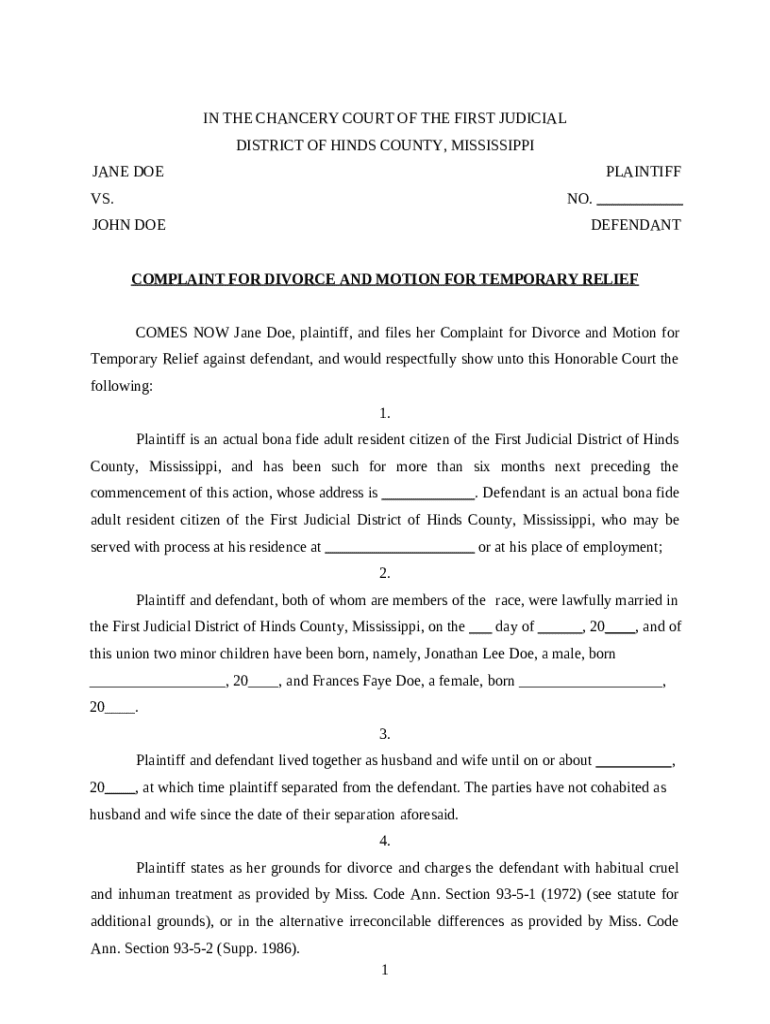 Get the free Complaint for Divorce and Motion for Temporary Relief template