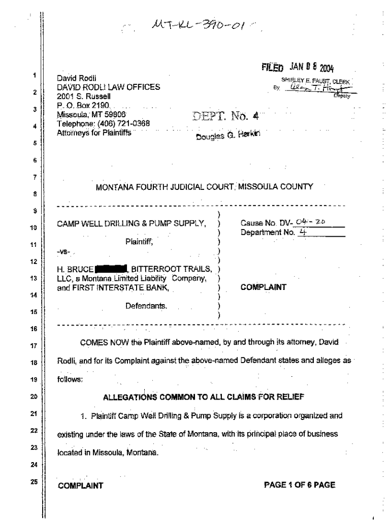 Get the free A01 Complaint for Breach of Well Drilling Contract Resulting in Construction Lien