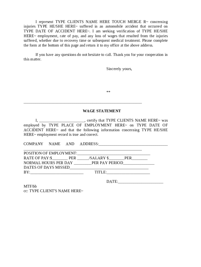 This is a Letter Re: Wage Statement, to be used in a personal injury cause of action.