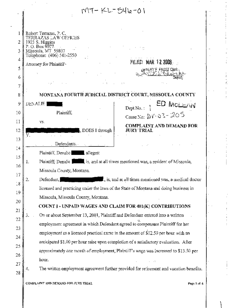 A01 Complaint and Demand For Jury regarding Wrongful Termination