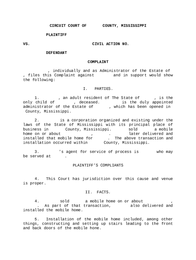 Complaint: A Complaint is the pleading which marks the beginning of a lawsuit. It states the allegations of the Plaintiff against the Defendant. This particular Complaint is to be used in a disagreement