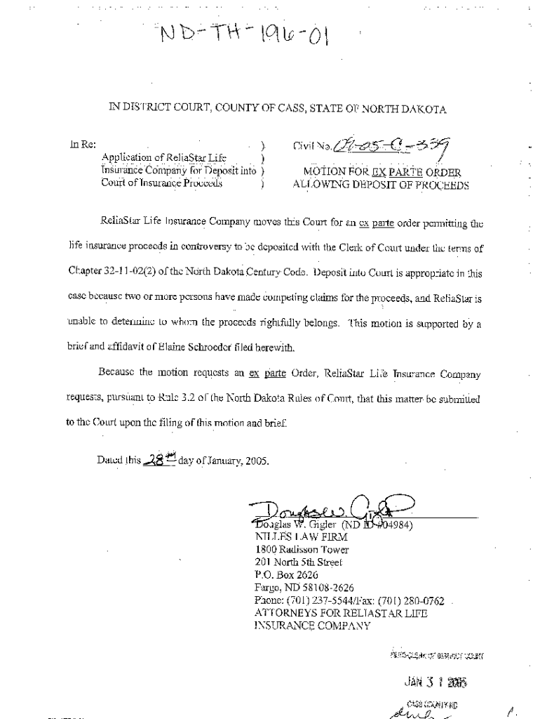 Get the free A01 Motion for Ex Parte Order Allowing Deposit of Insurance Proceeds