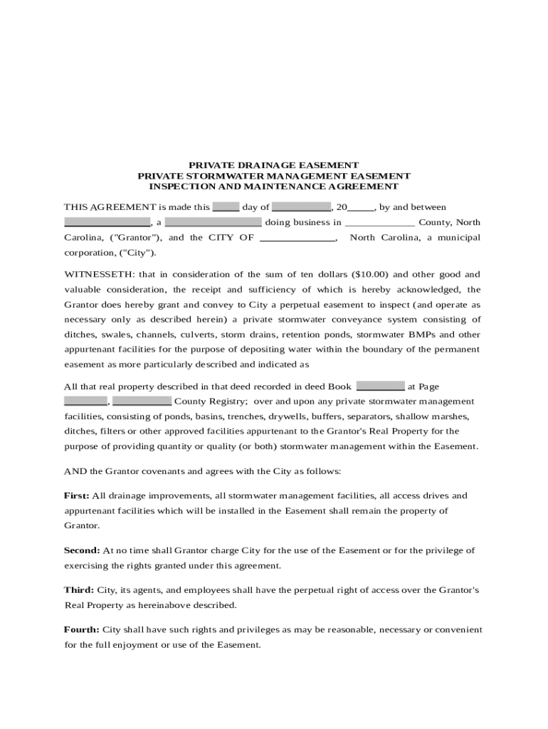 This Private Drainage and Stormwater Management Easement is made between a private property owner and a local North Carolina city government to grant a perpetual easement to the city for the purposes