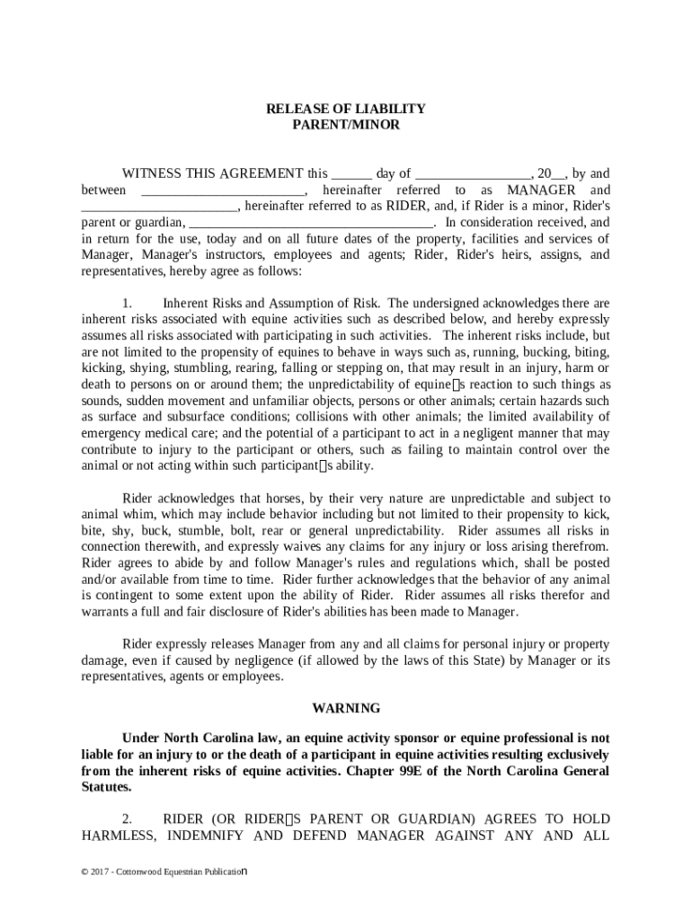Get the free Release of Liability Parent Minor - Horse Equine s template